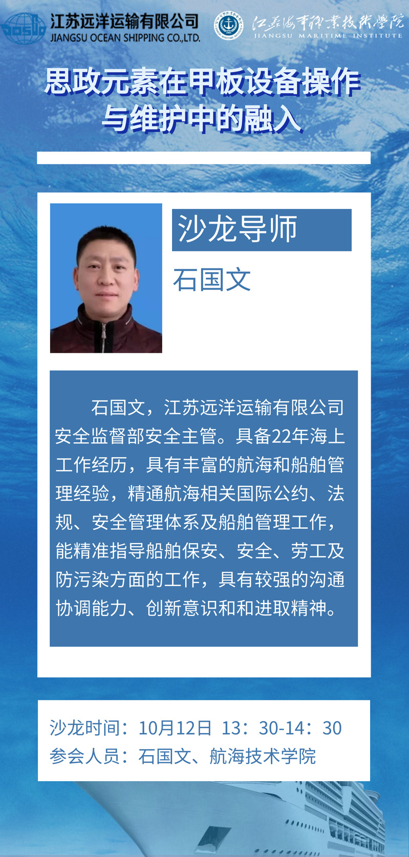 2022年10月12日,航海技术学院在腾讯会议举办“企业导师沙龙”,特邀江苏远洋运输有限公司安全监督部安全主管石国文为航海学院全体教职工作“思政元素在甲板设备操作与维护中的融入”专题讲座,会议由技能中心主任李二喜主持。