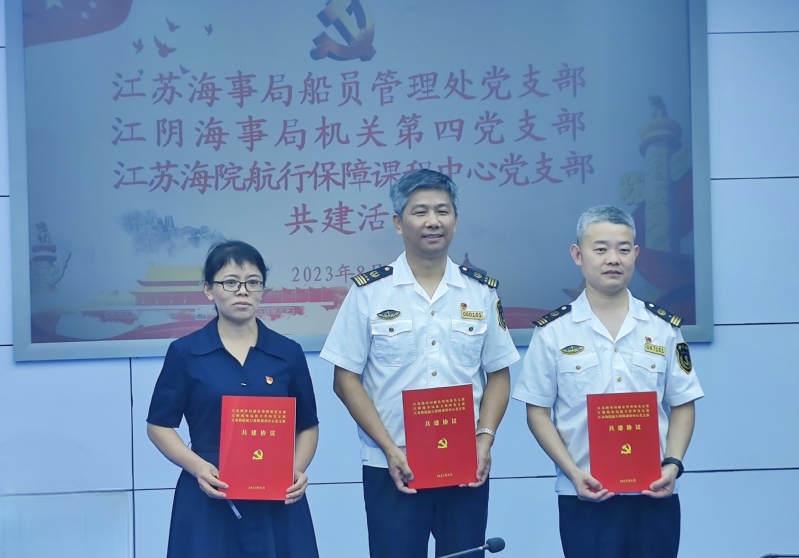 为深入学习贯彻党的二十大精神,推动学习贯彻习近平新时代中国特色社会主义思想主题教育走深走实,江苏海事局船员管理处党支部、江阴海事局机关第四党支部和我校航海技术学院航行保障课程中心党支部,根据“优势互补、资源共享、共同提高”的原则于2023年8月10日下午在江阴海事局开展了党支部结对共建活动,并签署了结对共建协议。江苏海事局船员管理处处长吴云锦、江阴海事局政委高革人、学校副校长陈晓琴参加了此次活动。