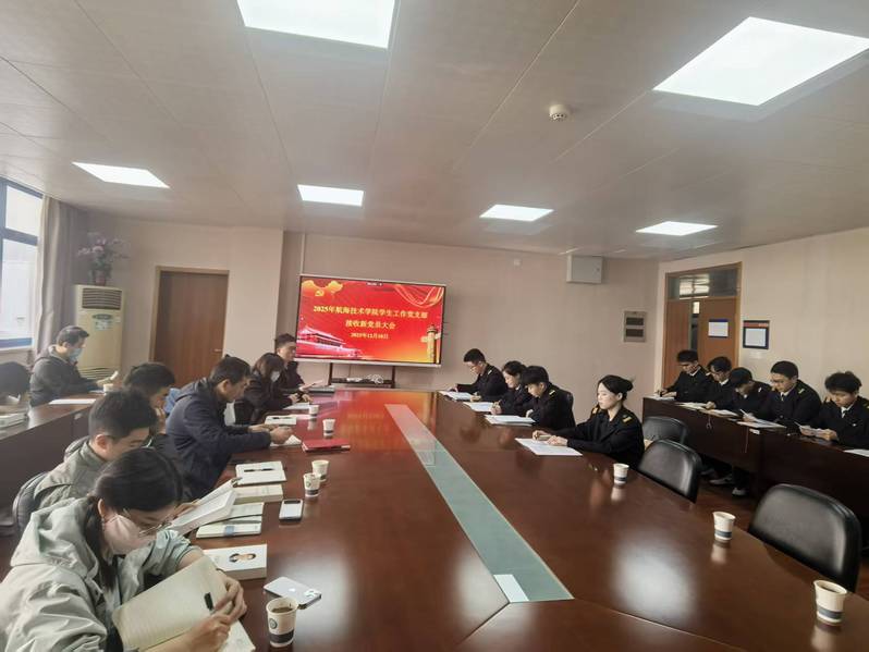 2025年12月10日中午,航海技术学院学生工作党支部在海鸿楼309召开接收新党员支部大会。支部党员老师与学生、入党介绍人出席了会议,13名党员发展对象参加了会议。会议由学生工作党支部书记郭若昕主持。